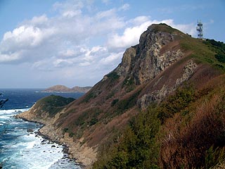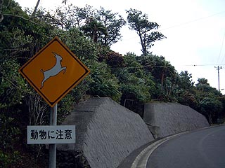 夜明山から中央山に向かう途中、見たこともない道路標識を見かける。動物注意の看板だが描かれている動物が珍しく、なんとヤドカリ。島固有のヤドカリが多く見られるとのことで、標識があるようだ。また、ここに来るまでも何種類かのヤギの標識を見かけた。ヤギもまた島にはたくさんいる。夜明山から見た、初寝浦へは、道路から1時間半山道を下りさらに来た道を引き返し登るとのことで、断念し、代わりに自転車を置き、中央山の山頂を目指した。山頂に向かうまでに、同じ宿で、昨日いっしょにお酒を呑んだ、高畠さん、廣畑さんに会う。「山頂は風が強いですよ。」と、予想通りの状況だ。行ってみるとやっぱりという感じで、腰がひけた姿勢でどうにか写真を撮った。