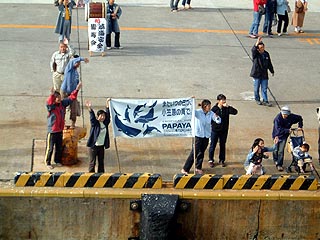 そうこして1時を回り、のんびりおが丸乗船場に向かった。乗船手続きを済ませ乗船を待つと、宿に泊まっていた人も揃い、一緒に写真などを撮った。宿のほとんどの人は帰りも2等ということもあり、出航間際にまとめて乗船した。荷物を置き、すぐにデッキへ。パパヤのスタッフの方がすでに見送りに来ていた。目立つノボリで分かりやすい。