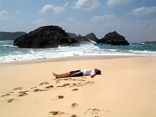 「蟻地獄」に驚いた後、別の道が見つからなかったので、最初の道に戻り、崖を降り、ジニービーチに向かった。こちらにも先客がいたので、ここから降りるしかないと思い、若干滑りながらジニービーチに着いた。前を行っていた先客に、どっか見覚えがあるなと思ったら、同じ部屋の阿部さんでした。彼は、原チャで私の後にジニービーチへ来たが、高山の分岐でもう1つのルートを通り、私を追い抜いたようで、まったく彼に気付かなかった。