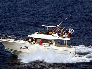 南島に1時間上陸したあと、ミスパパヤ号に戻り、南島に上陸しないでミスパパヤ号に残っていた方にイルカが出たことを聞きました。エントリーの時に方向を間違えたようで、泳いだみなさん、かなり悔しい表情でした。南島を離れ、イルカを探すと、すぐにミナミハンドウイルカの群れを発見。これまたうねりの中です。昨日の風邪をひいた状態で、すっかり油断してウエットスーツの上半身を脱いでいたため、準備に出遅れドルフィンスイムを断念。船でイルカたちの様子を伺う。波は高いが、3度イルカの群れに良いタイミングで泳いだ人は近づいていた。「後ろからも来るぞ!」と船の人は泳いでいる人に教える。目に前のイルカに夢中になると確かに方角やほかのイルカがいることも分からなくなります。